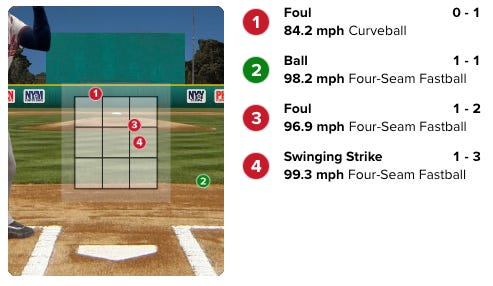 [Editor’s Note: I was bothered by this discrepancy, I didn’t think Savant could be that wrong, and so I went back and watched the top of the 4th inning again. Savant was right about Mateo. He swung through an awesome heater. The pitch I saw was a swinging strike by Dominic Smith on a 93 mph change up with incredible tailing action that put him behind 0-2.]