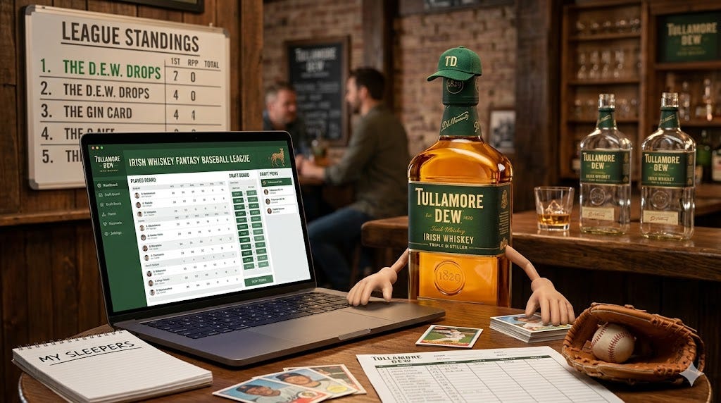 In January I got an email from a publicist who asked if I wanted to do something (what?) with the Irish whiskey, Tulamore D.E.W. I ignored her because I write a newsletter. Why would she think I’d be able to help to her and her brand? But she followed up. I said to her that I liked whiskey and I knew and liked Tulamore D.E.W. because my father-in-law had turned us onto it after he visited the distillery on a trip to Ireland. I asked her why she’d want me to write about it? She said St. Patrick’s Day was coming and they hoped to get out the word to the fantasy baseball world.