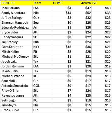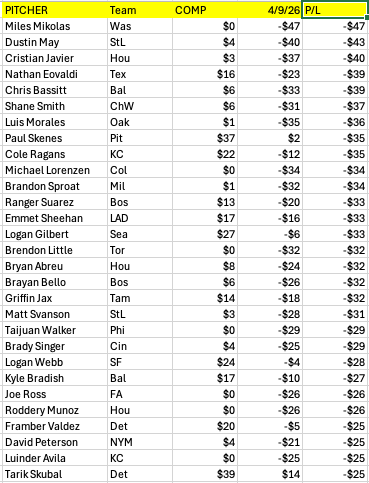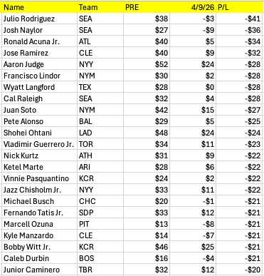The same is true of the hitters, except that this list selects for the most expensive hitters who are doing the least. It’s too soon to panic, but always worrisome when your best players aren’t doing it.