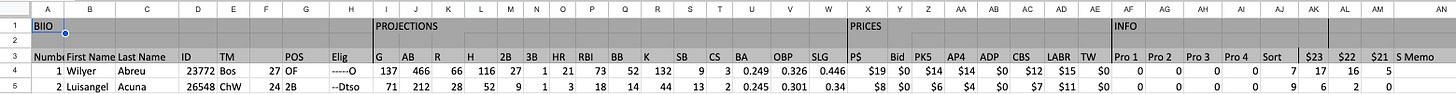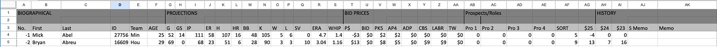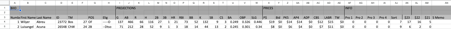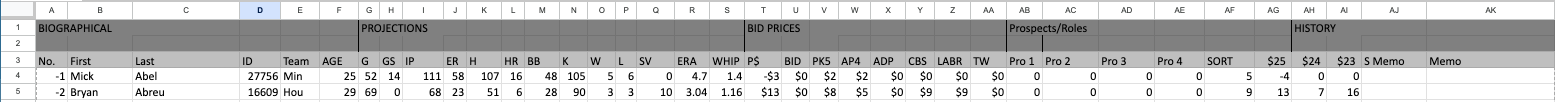 We’re now in the heat of the fantasy drafts and we have Master Sheets that have projections, suggested roto prices, expert roto league prices from CBS Analysts and the LABR leagues, and projections in simple spreadsheet. Here’s a screen capture of the first two lines: